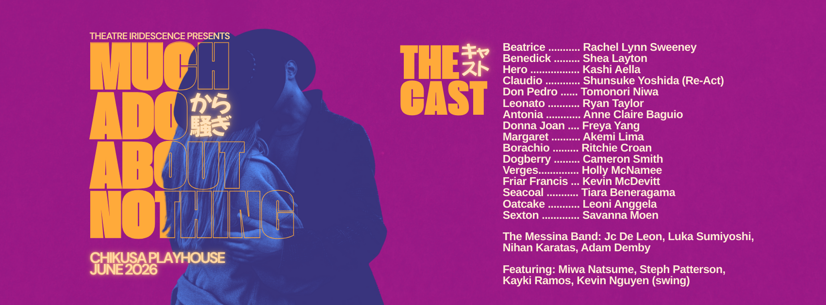 2026年上演予定の『から騒ぎ(Much Ado About Nothing)』の豪華キャストを発表できることを、大変うれしく思います。本公演では、これまでおなじみの出演者に加え、新たな才能あふれるキャストが参加し、海外でのトレーニング経験を持つ俳優と、地域の演劇界で活躍する俳優が一堂に会します。2026年6月に上演予定の、活気に満ちた印象深い舞台をぜひお見逃しなく。チケット情報や舞台裏の様子についても、今後順次お知らせいたします。